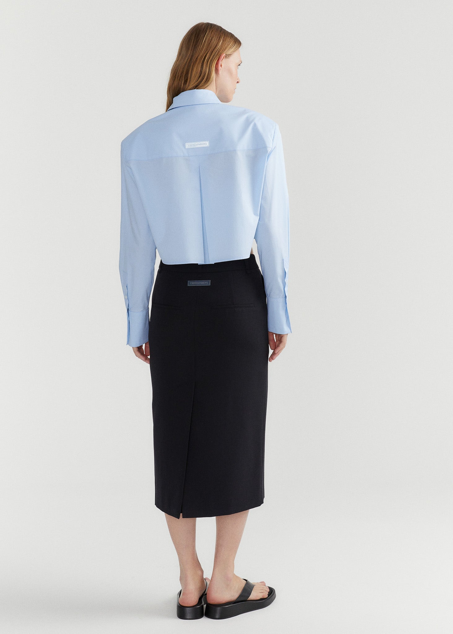Iconic midi skirt in the characteristic ZWINGENBERG tailoring style with a high slit at the back and side pockets. The skirt has a mid-rise waistband, a figure-hugging fit and is lined throughout with the finest viscose. Made in our studio in Germany from the finest quality gabardine woven in Germany, it is the perfect companion to all ZWINGENBERG tailoring styles.